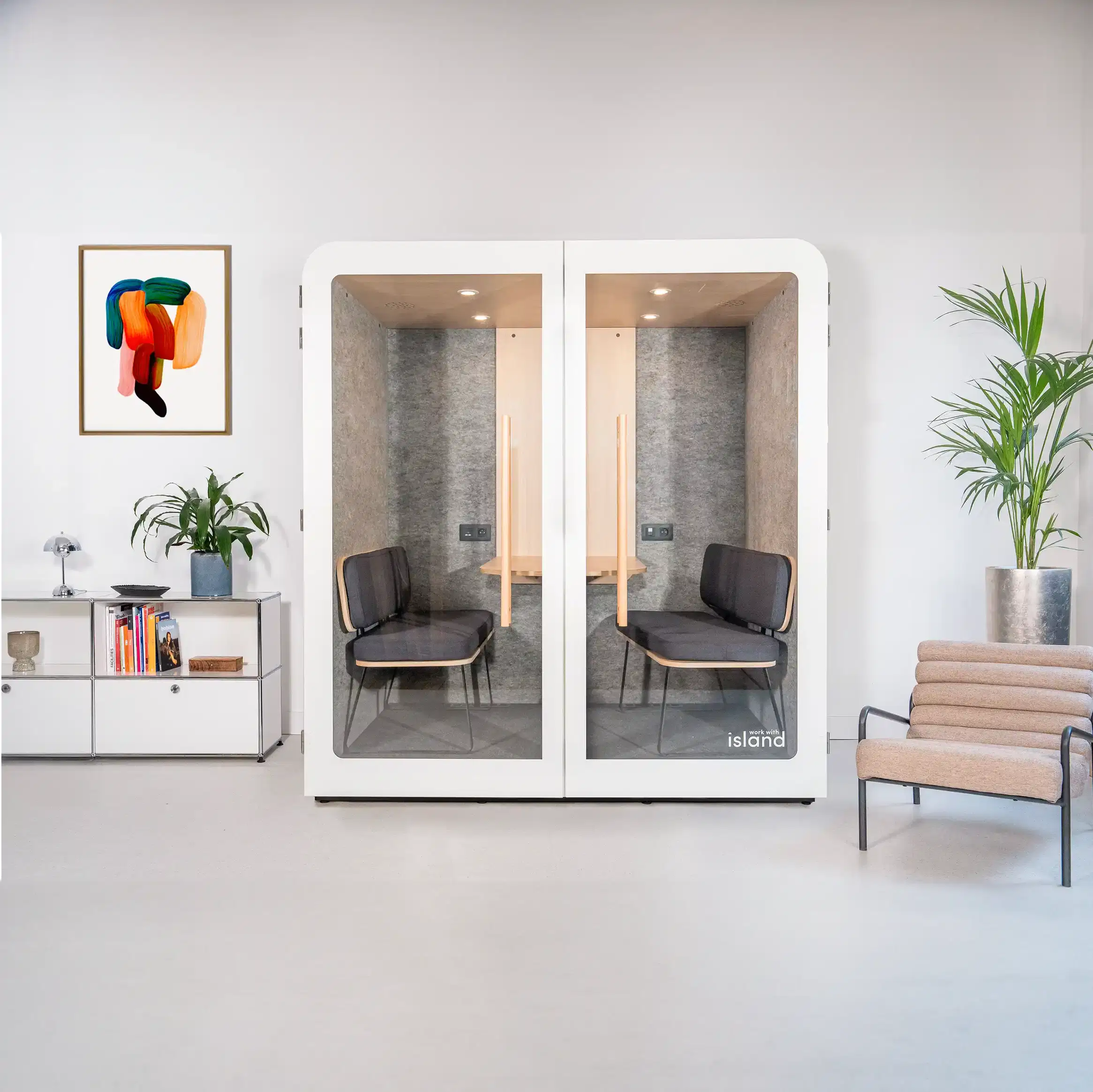 La cabina Quattro, con solo 2,5 m² en el suelo, se integra fácilmente en cualquier espacio. Instalada en un open space o cerca de una zona de paso, libera las salas de reunión, facilita los intercambios espontáneos y reduce el ruido general en la oficina.