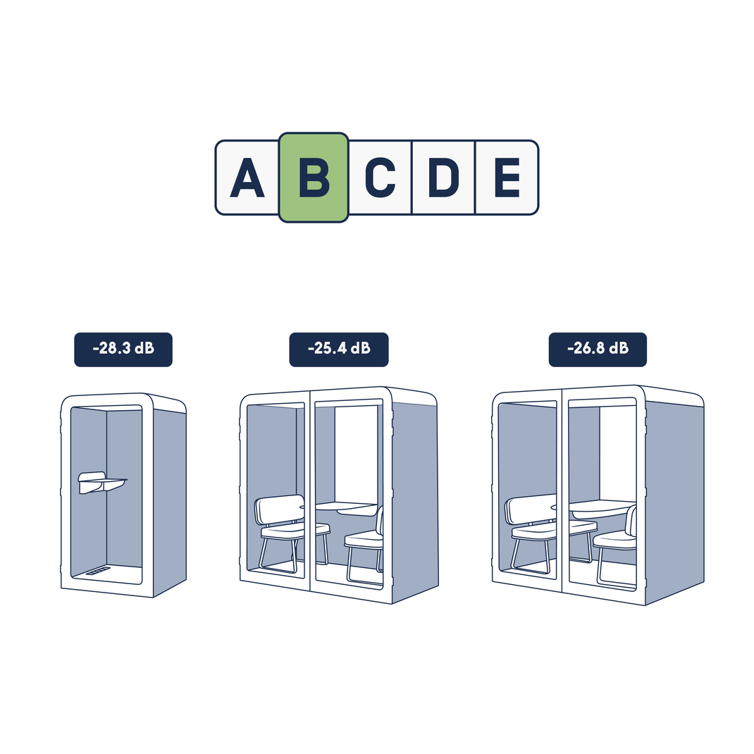 La norme ISO 23351-1 classe les cabines acoustiques en différentes catégories en fonction de leur performance acoustique, allant de la lettre A+ à E. Ce classement permet aux utilisateurs de choisir la cabine la mieux adaptée à leurs besoins en matière d'insonorisation, en fonction de l'environnement de travail et du niveau de bruit ambiant.
