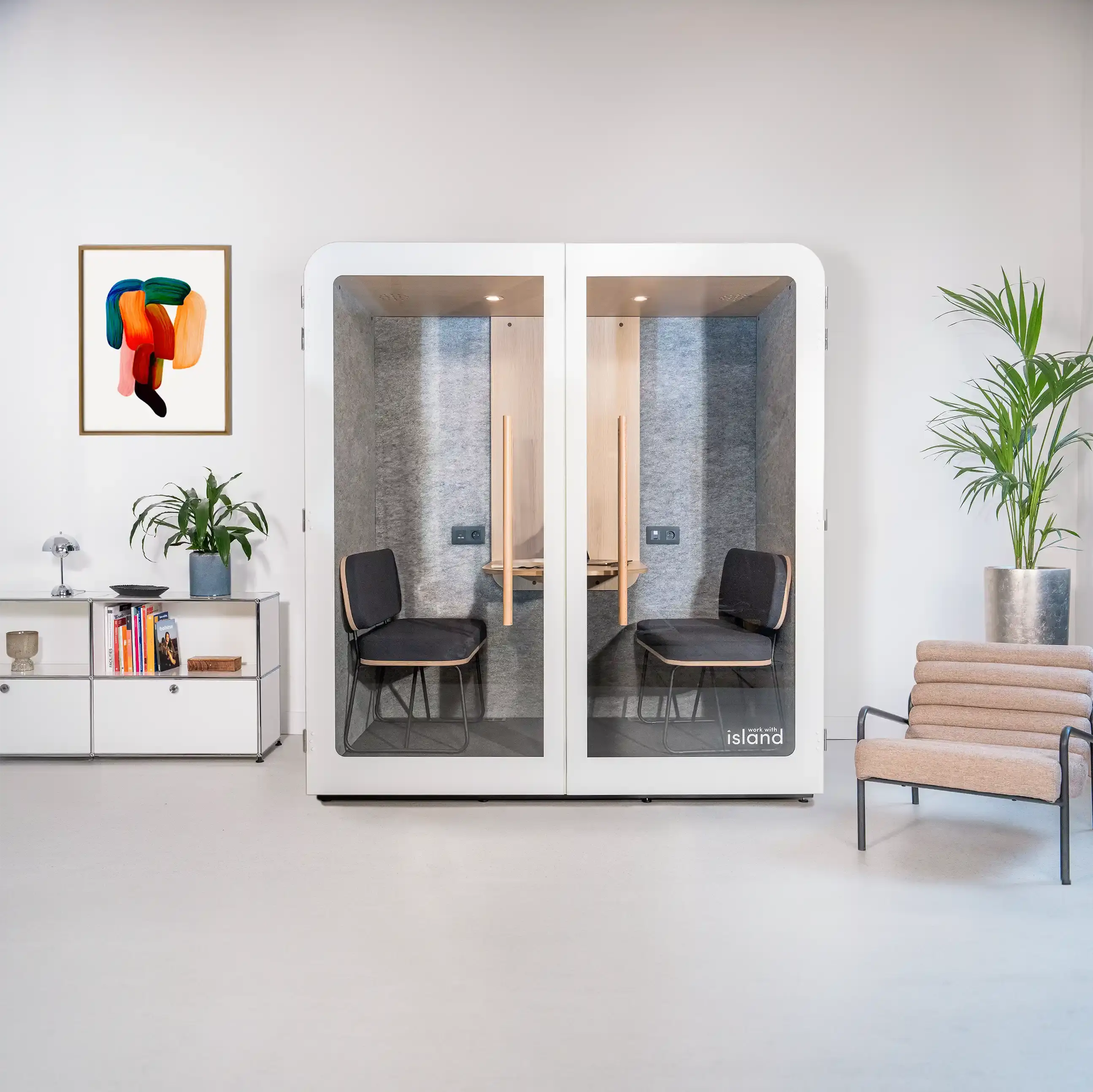 - Zones calmes : Pour la concentration individuelle ou les appels, comme les cabines acoustiques Island Duo ou Island Quattro.