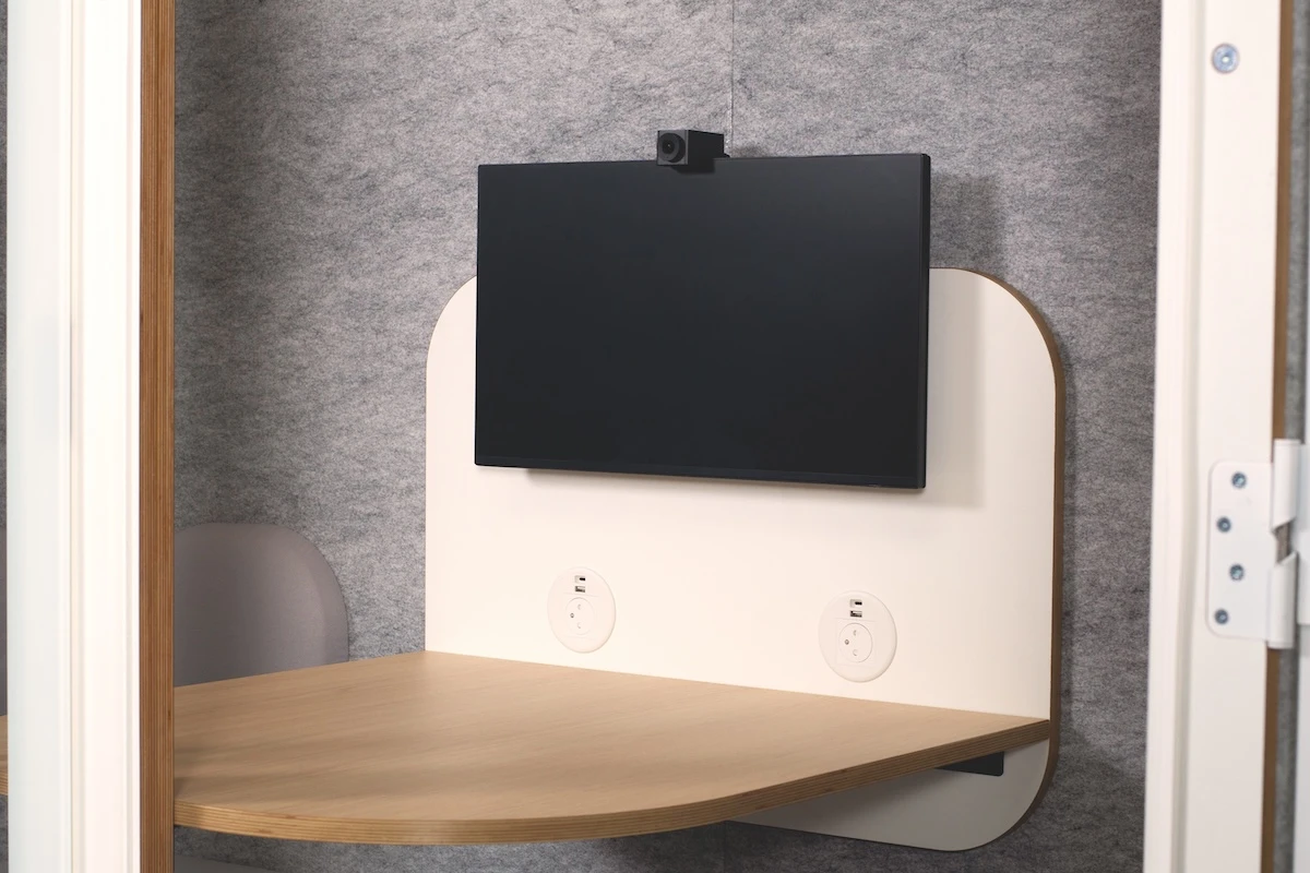 Pour les collaborateurs qui ont besoin de s'isoler plus longtemps — rédaction, analyse, sessions de design — la cabine debout ne suffit pas. Le format assis avec bureau intégré transforme la cabine en véritable poste de travail individuel.