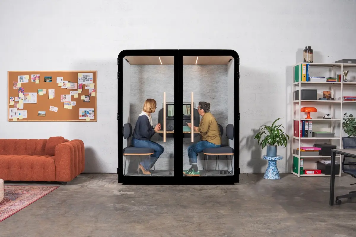 Les cabines acoustiques Duo répondent au besoin croissant d'espaces de réunion informels pour deux personnes. Le modèle Island Duo présente une réduction sonore de 28,7 dB (classe A), créant un environnement propice aux échanges confidentiels.