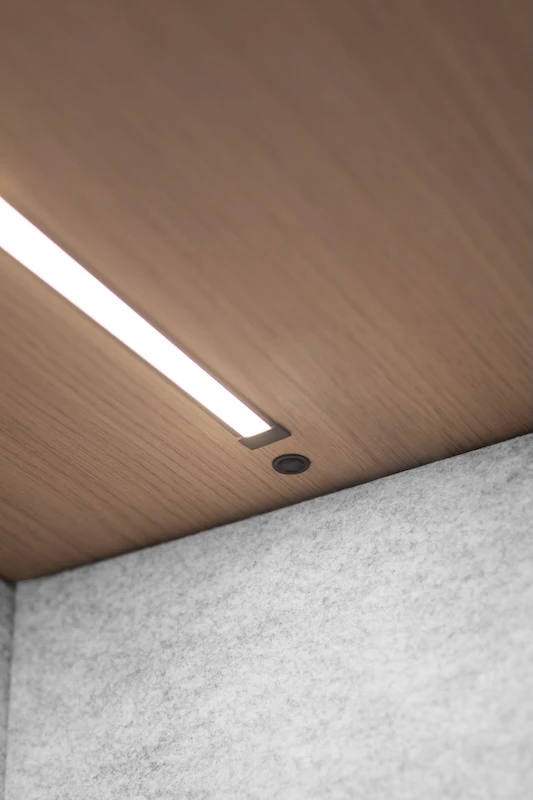 Les espaces collaboratifs pour réunions en tête-à-tête occupent 2 m² avec une connectique renforcée. La réduction acoustique de 28,7 dB garantit la confidentialité des échanges même en open space bruyant.